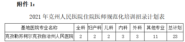 1、克州人民醫(yī)院2021年住院醫(yī)師規(guī)范化培訓(xùn)招生計(jì)劃表,詳見(jiàn)附件1。