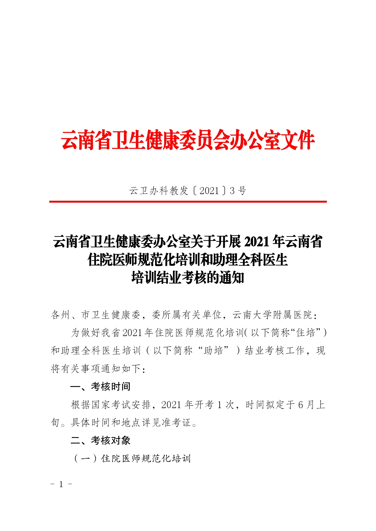 近日,“云南省衛(wèi)生健康委員會”發(fā)布了“【結(jié)業(yè)考核】2021年云南省住院醫(yī)師規(guī)范化培訓(xùn)和助理全科醫(yī)生培訓(xùn)結(jié)業(yè)考核通知”,為了方便各位考生了解,醫(yī)學(xué)教育網(wǎng)小編特地為大家專門整理了相關(guān)文件,具體內(nèi)容如下: