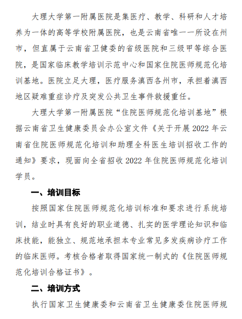 相關(guān)附件: 大理大學(xué)第一附屬醫(yī)院2022年住院醫(yī)師規(guī)范化培訓(xùn)基地招生簡章