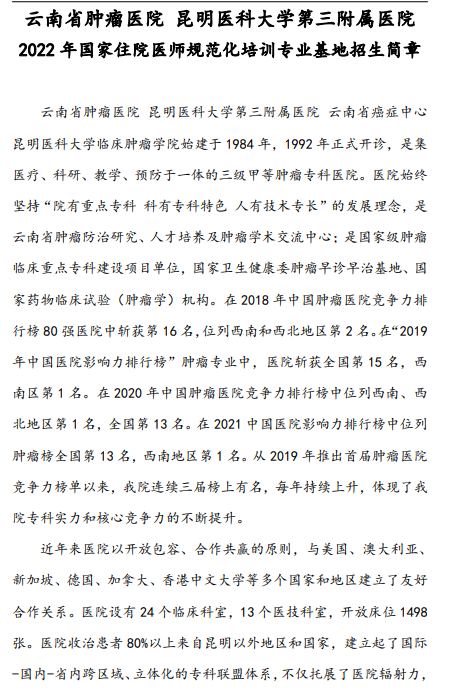 相關(guān)附件: 云南省腫瘤醫(yī)院2022年國家住院醫(yī)師規(guī)范化培訓(xùn)專業(yè)基地招生簡章