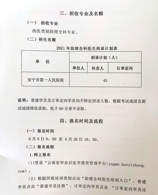 以上就是“安寧市第一人民醫(yī)院2022年助理全科醫(yī)生培訓招生簡章”的全部內(nèi)容,由醫(yī)學教育網(wǎng)小編整理,希望對您有所幫助!想要了解更多關于住院醫(yī)師規(guī)范化培訓考試相關政策,請繼續(xù)關注此欄目!
