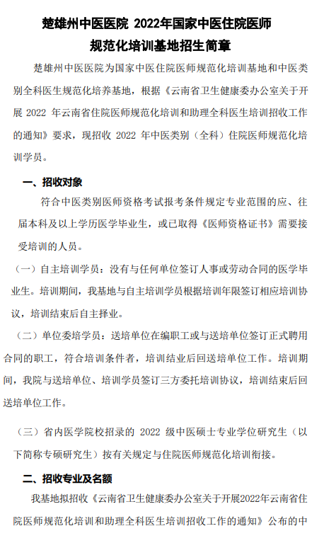 相關附件:楚雄州中醫(yī)醫(yī)院2022年國家中醫(yī)住院醫(yī)師規(guī)范化培訓基地招生簡章