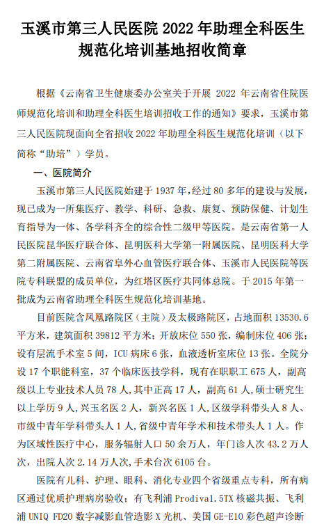 相關(guān)附件:玉溪市第三人民醫(yī)院2022年助理全科醫(yī)生規(guī)范化培訓(xùn)基地招收簡章