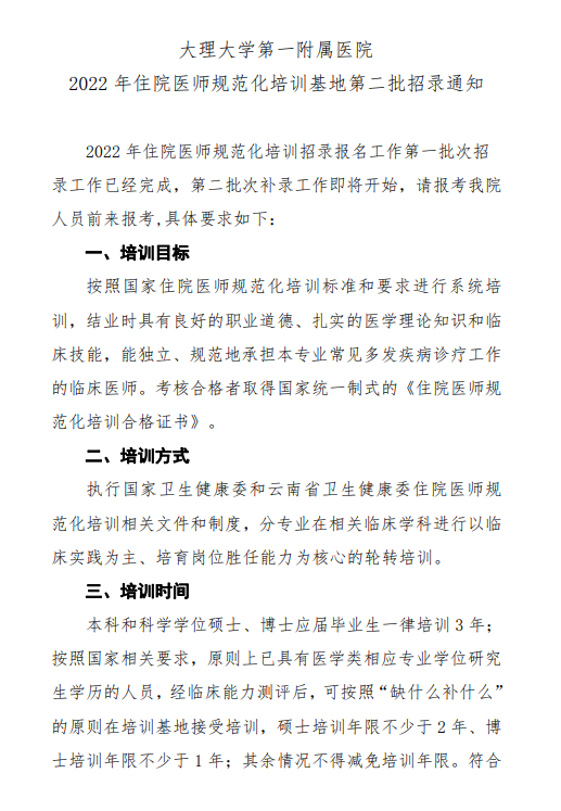 相關(guān)附件: 大理大學(xué)第一附屬醫(yī)院2022年住院醫(yī)師規(guī)范化培訓(xùn)基地第二批招錄通知